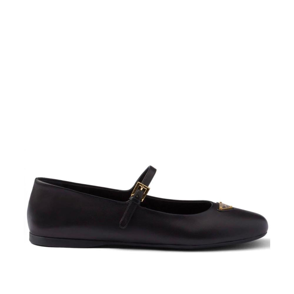 يتميز الحذاء بجزء علوي مصنوع من جلد نابّا الفاخر، مع حزام رفيع مزود بإبزيم معدني ذهبي وشعار Prada المثلث البارز في الأمام، مما يضيف لمسة راقية على كل إطلالة.