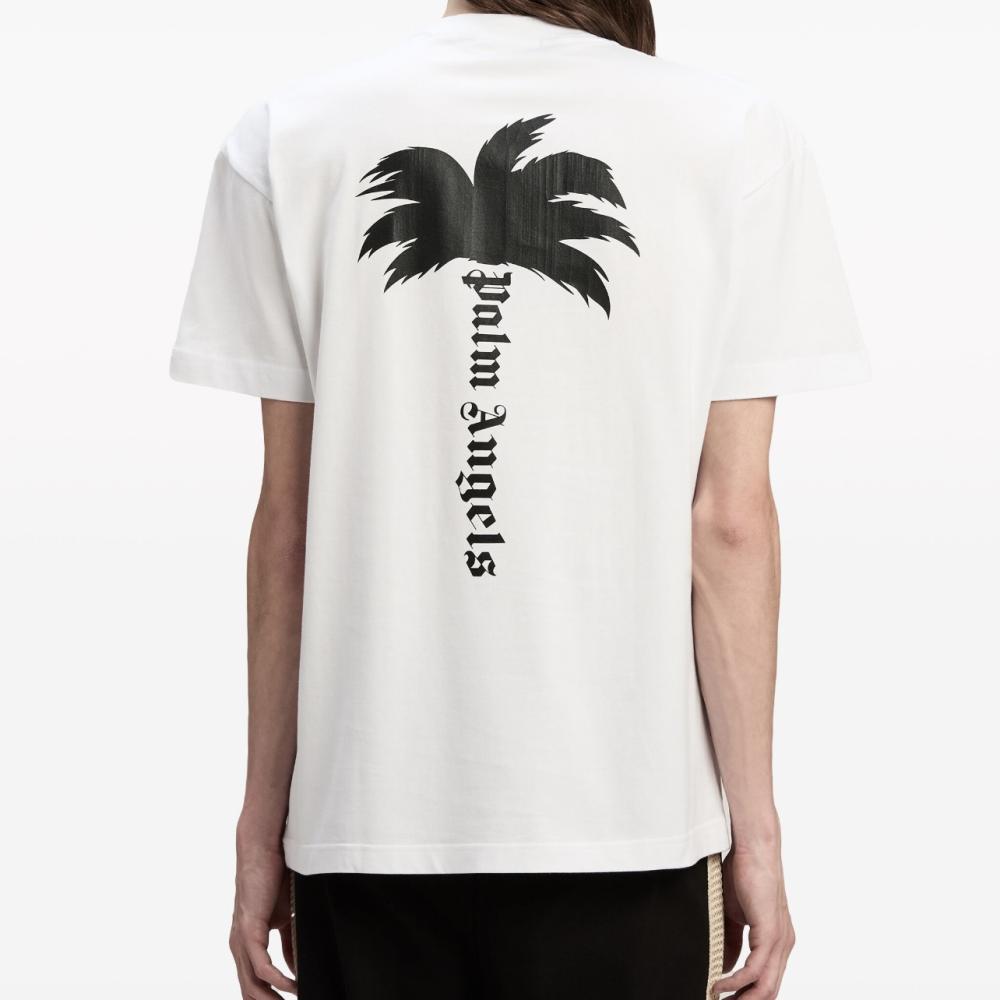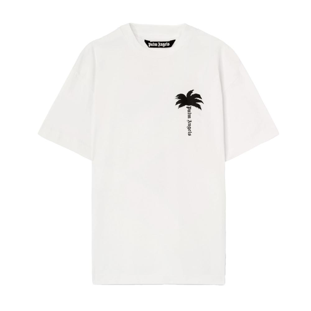 تيشيرت Palm Angels Palm Tree Printed Crewneck مصمم بقصة كلاسيكية مع ياقة مستديرة، ويتميز بطبعة جذابة تصور شجرة نخيل.