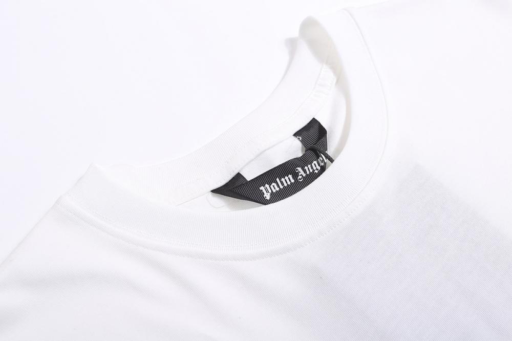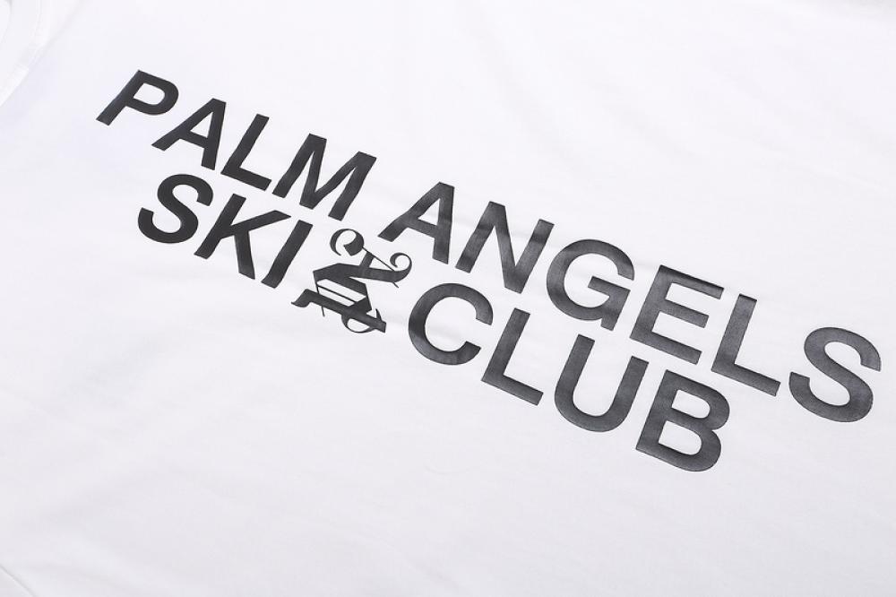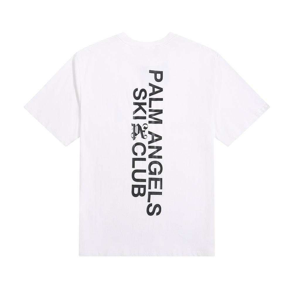 تيشيرت أبيض فاخر من Palm Angels بتصميم بسيط من الأمام يحمل شعار العلامة، بينما الظهر يبرز بتصميم جريء طولي مكتوب عليه PALM ANGELS SKI CLUB بالمنتصف.